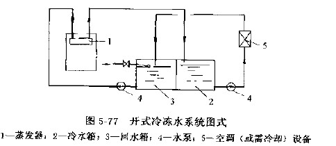 图5--77为开式冷冻水循环系统,主要由冷冻水水箱、回水箱、水泵等组成。