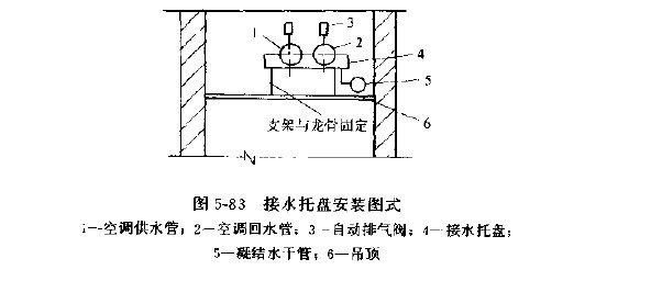 当自动排气阀安装在吊顶内时,为了防止因其失灵而跑水污染吊顶,在吊顶净空高度允许的情况下,安装一接水托盘(图5--83),托盘接出管道与排凝结水管连通。