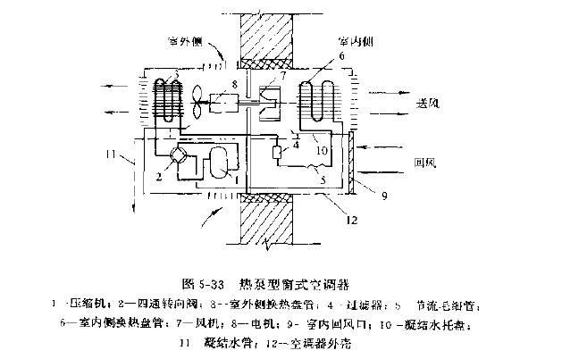 热泵型窗式空调器的工作原理基本与风冷式热泵型冷水机组相似(图5---33)。