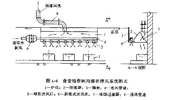 图4---6为一食堂操作间,烹饪中产生出的高热、高湿、油烟等有害物质,会危害长期在此工作的操作人员的身体健康。当采用局部送排风系统。在操作人员工作时,即可通过送风系统送人一定量的新鲜空气至工作区内,既可改善高温气体的危害,又可稀释有害物质的浓度。而通过排风系统可将油烟热气通过排气罩排风口将其排出室外,排气罩还可做油脂收集槽,并定期排放和清洗,可有效改善操作区的工作环境,还可控制油烟、热气的扩散。