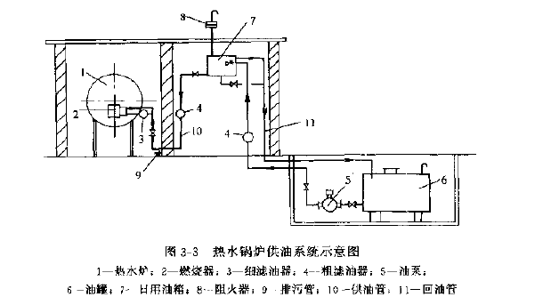 (2)日用油箱:为了避免油泵频繁启动并使供油稳定,应在锅炉间以外的专用房间内设置一较小容积的日用油箱。日用油箱容积可根据锅炉额定供热量、锅炉日运转小时数、燃油发热量、燃油比重、锅炉热效率等因素确定,一般可选择容积0.5~1.5m3为宜。油箱顶部接有通气管,通气管上安装阻火器。