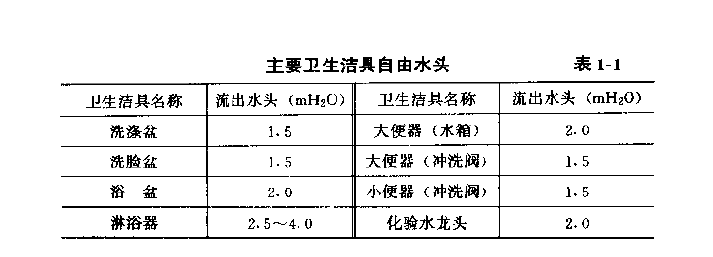 自由水头就是配水点(即各种卫生洁具给水龙头)前所需流出的压力。这个压力是为了克服该配水龙头内的摩擦冲击或流速变化而产生的阻力。只有克服该阻力,水才能顺畅流出。如低于该压力,出水量就会减少,或根本无法流出水来。不同的卫生洁具的配水龙头的自由水头均不同,表1--1列出几种主要洁具的自由水头值。