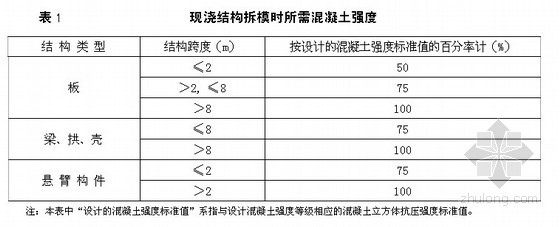 2.底模,应在同一部位同条件养护的混凝土试块强度达到要求时方可拆除(见表1)。
