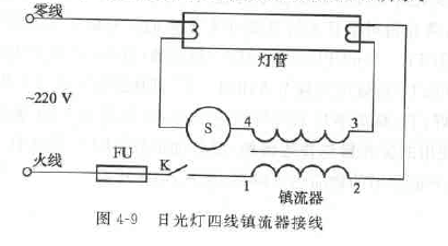 答:四线镇流器有四根引线、分主、副线圈,主线圈的两引线和二线镇流器接法一样,串联在灯管与电源之间。副线圈的两引线.串联在起辉器与灯管之间.帮助起动用。由于副线圈匝数少.交流阻抗亦小,如果误把它接入电源主电路中,就会烧毁灯管和镇流器,所以.把镇流器接人电路前.必须看清接线说明,分清主、副线圈。也可用万用表测量检测,阻值大的为主线圈阻值小的为副线圈正确接线法如图4--9所示。