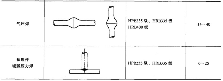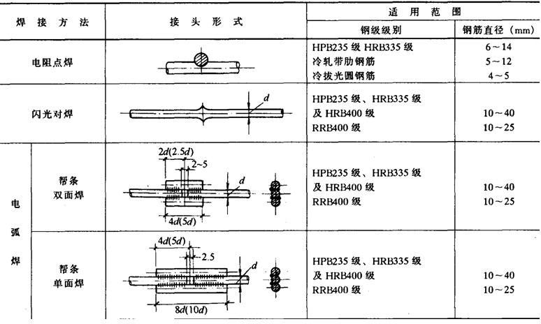 2.电阻电焊时,适用范围内的钢筋直径系指较小钢筋的直径。