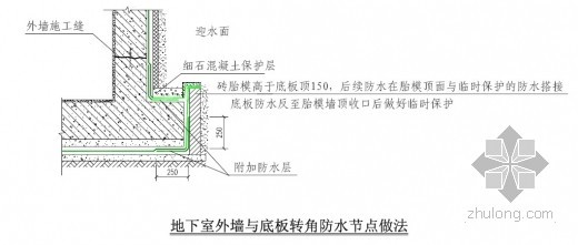 底板未做防水时,底板外侧可支设模板,拆除模板后,外墙防水延伸至底板下部转角处即可,注意做好阴阳角防水附加层后再施工外墙及转角防水层。