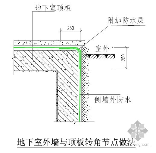 防水附加层施工前须将基层修补、清理干净,在外墙与顶板交接阳角部位施工防水附加层,防水附加层向下、平伸各不小于250mm。