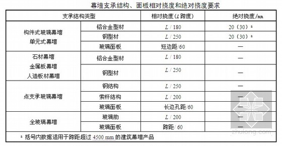 2、在抗风压性能指标值作用下,幕墙的支承体系和面板的相对挠度和绝对挠度不应大于表11的要求。