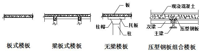 类型 :板式楼板、梁板式楼板、无梁楼板、压型钢板组合楼板