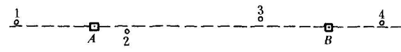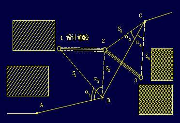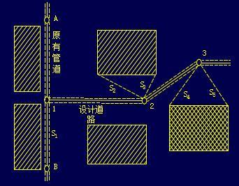 A、B为原有道路的检修井,1、2、3为设计道路的主点,欲用距离交会法在地面上测定主点的位置,可依比例尺在图上量出S1、S2、S3、S4、S5,即为主点的测设数据。