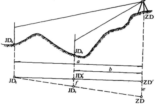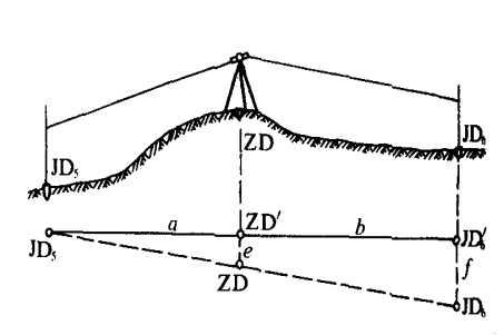 将ZD沿偏差的相反方向横移至ZD。将仪器移至ZD,延长直线JD5ZD看是否通过JD6或偏差小于容许值,否则应再次设置转点,直至符合要求为止。