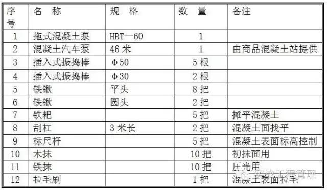 各种使用机具(每次浇筑混凝土配备)详见表-1。