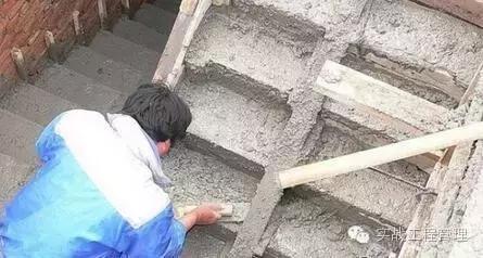 4)楼梯段混凝土宜自下而上浇筑,先振实楼梯板混凝土,达到踏步位置与踏步混凝土一起浇筑,不断连续向上推进,并随时用木抹子将踏步上表面抹平;楼梯混凝土宜连续浇筑完成。