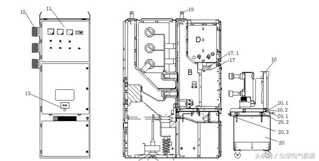 1、母线 2、绝缘子 3、静触头4、触头盒 5、电流互感器6、接地开关 7、电缆终端 8、避雷器 9、零序电流互感器 10、断路器手车 10.1、滑动把手 10.2、锁键(联到滑动把手) 11、控制和保护单元 12、穿墙套管 13、丝杆机构操作孔 14、电缆夹 15.1电缆密封圈 15.2、连接板 16、接地排 17、二次插头 17.1联锁杆 18、压力释放板 19、起吊耳 20、运输小车 20.1、小车锁定把手 20.2、调节螺栓 20.3、锁舌