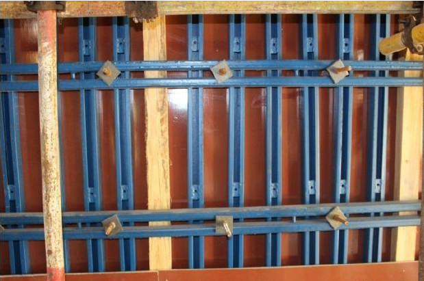 (1)墙体模板采用板块式,现场拼接,每块模板1220 宽,竖向次龙骨采用50mm60mm,壁厚2.5mm 的C 型钢,间距视墙厚,200 厚墙中距210mm;