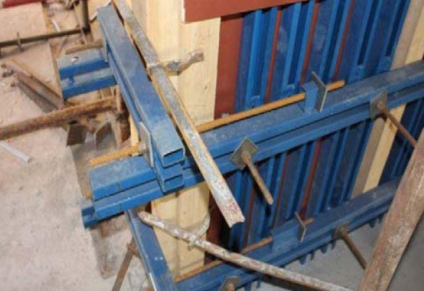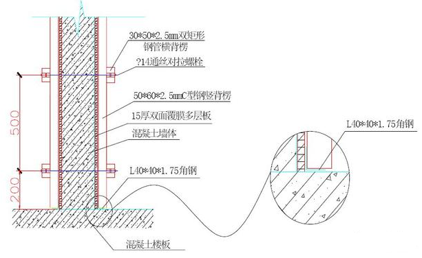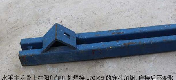 (4)水平主龙骨上在阳角转角处焊接L705 的穿孔角钢,用对拉螺栓斜拉固定,把两方向主龙骨连接成整体,同时利用三角原理,保证阳角不涨模;
