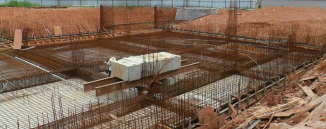 (3)筏板钢筋绑扎、模板安装:按设计图纸要求绑扎基础底板和梁钢筋,并插好墙、柱及其他预留钢筋,然后安装梁、柱、墙侧模。