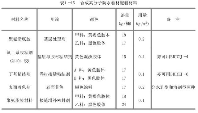 3.合成高分子防水卷材施工的配套材料,见表1 -15 。