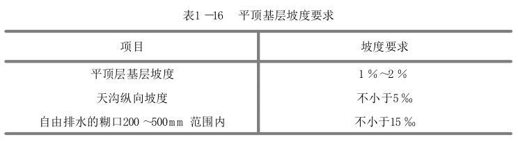 (1) 找平层的做法和要求,见表1 -3 。如无保温层的预制屋面板接头部位高低参差不齐或凹坑较大时,应采用掺水泥用量的20 %107 胶的1∶2.5 ~1∶3 的水泥砂浆修整平顺。