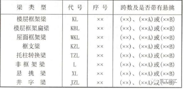 例:KL7(5A)表示第7号框架梁,有5跨。一端有悬挑