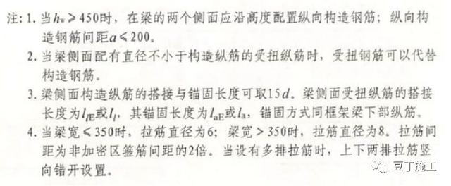 当梁腹板高度Hw450mm时,须配置纵向构造钢筋,该项注以大写字母G表示,注写设置在梁两个侧面的总配筋值,且对称配置
