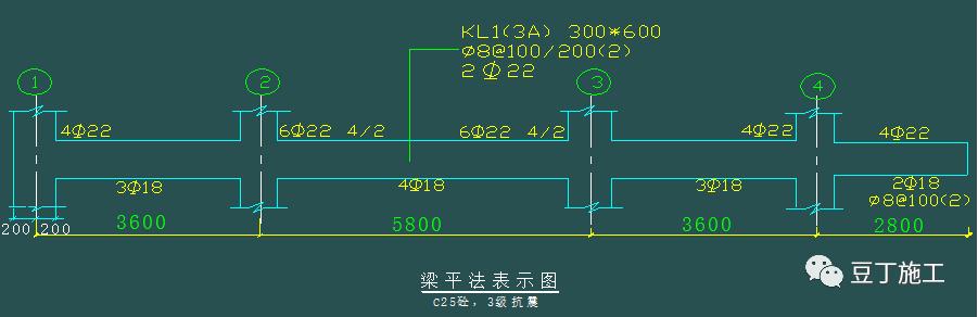 原位标注表示:支座1上部纵筋为4根直径22的二级钢,支座2两边上部纵筋为6根直径22的二级钢分两排,上一排为4根,下一排为2根;第一跨跨距3600,下部纵筋为3根直径18的二级钢,全部伸入支座,;第二跨跨距5800,下部纵筋为4根直径18的二级钢,全部伸入支座;以后类推。