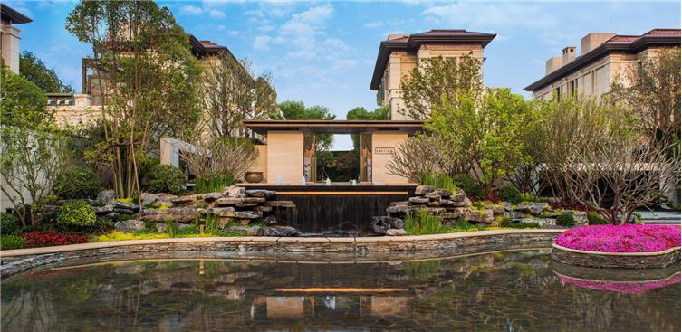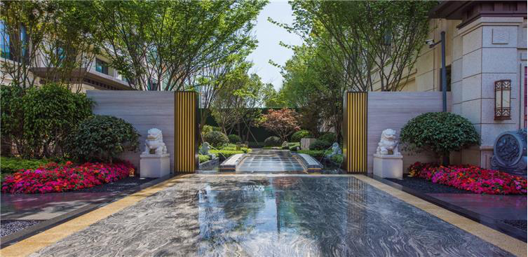再跟随我来到龙湖嘉天下住宅,面向波光粼粼湖景,向东探寻,花木掩映、雾气氤氲,新中式照壁飞下与运用石材凹凸错位及肌理体现山形,水帘倾泻,现代写意山水与迎客松相迎相应;寻着潺潺水声,穿过繁华锦簇的林间小径,闽南中式院落生活即将启幕。