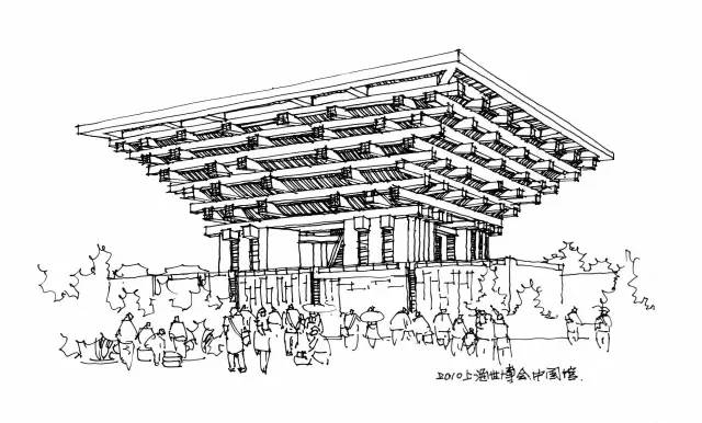 【秘笈】建议在徒手表达中,越靠近视平线的透视线,透视角度宁可小一些,画得略平,尤其是视平线以下的透视线要宁平勿斜,这样看起来透视会比较平稳准确。一旦这些透视线的角度超过了正确角度,透视就一定不准,建筑的面就会有外翻的感觉。笔者长期的经验是:画照片时如果视平线以下的透视线完全按照实际画出来的地面是外翻的。按照人的理解去画透视线,这样得到的透视线会比照片略平一些,符合人的观察感受,如图中所示,就是利用快速的透视方法来绘制的。