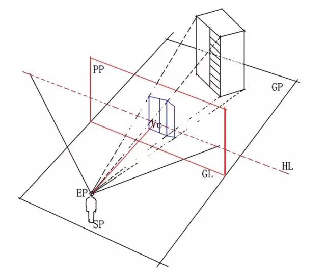(2)画面 PP:人与物体之间的假设面,透视图所在的平面。