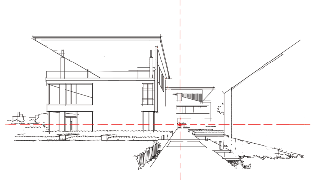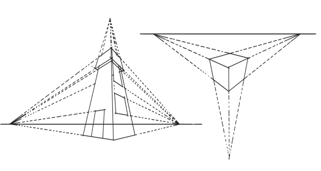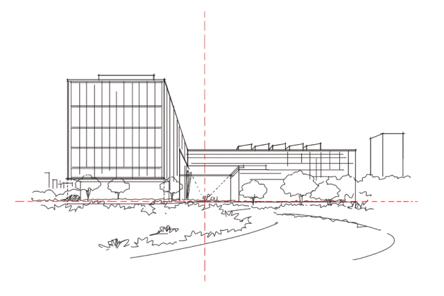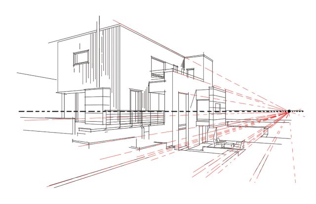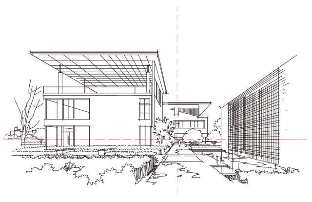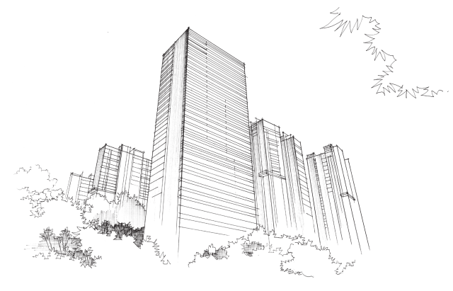 在建筑画绘制的过程中,除了一点透视外,最常用的是两点透视,建筑一般是较大体量的物体,因此,对于绘制高层建筑和表达大空间时,时常会用到。