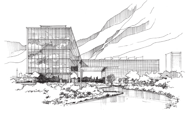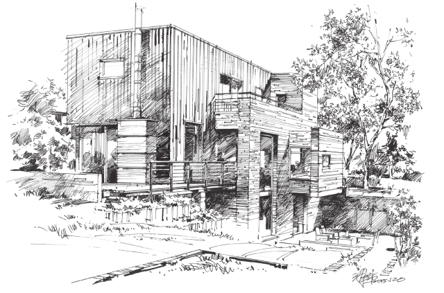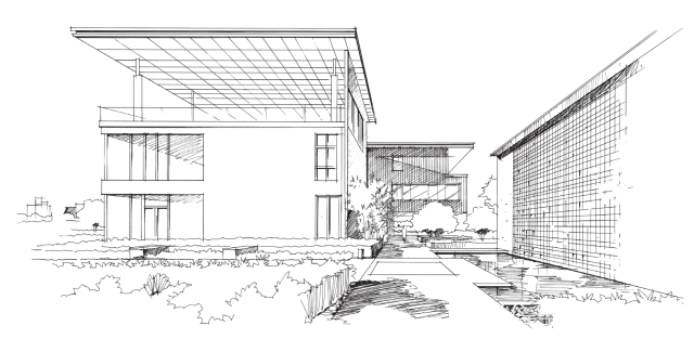 要点三:继续深入画面,去掉多余的辅助线,深入刻画建筑外墙面的材质和建筑配景,此步骤注意要表现建筑配景和建筑的协调统一关系。要点四:最后深入画面 ; 建筑配景中的乔木、水体、灌木丛等,用线时要和建筑区分开,一般在表达配景时多为植物,注意植物叶子和灌木整体的形状表达;建筑画和建筑配景视为一个整体,光影的统一、线条的虚实、素描关系的处理都是表达的要点。