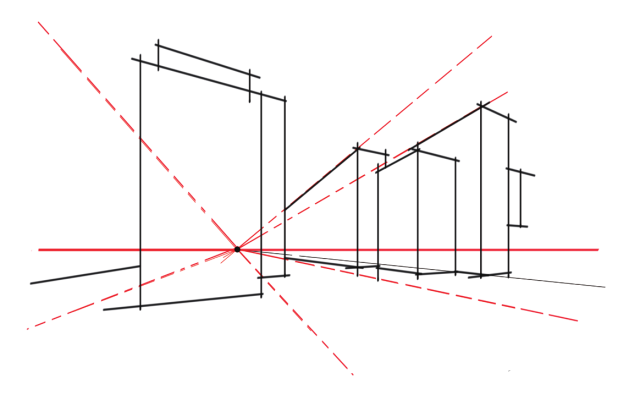 3、注意画面中的两个消失点,所有的透视线连接那两个点。