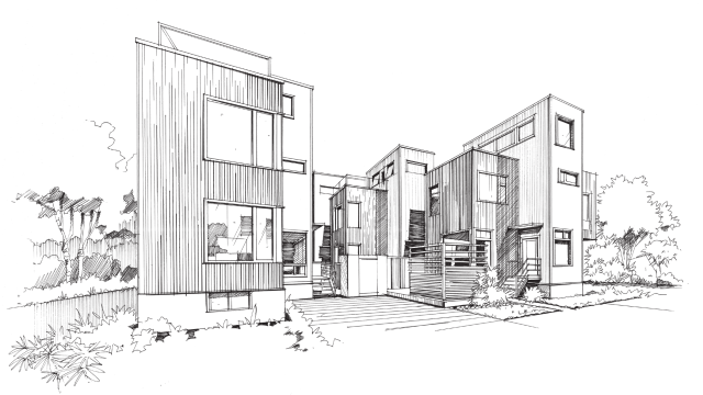要点三:继续深化画面,去掉多余的辅助线,深入刻画建筑的结构、材质和配景在画面中的大小、比例和光影关系。这一步骤要注意建筑配景和建筑的协调统一关系。要点四:最后深入刻画,建筑配景中的灌木丛、天空等,用线时要和建筑区分开,注意画面的主体表达和画面虚实关系的处理。