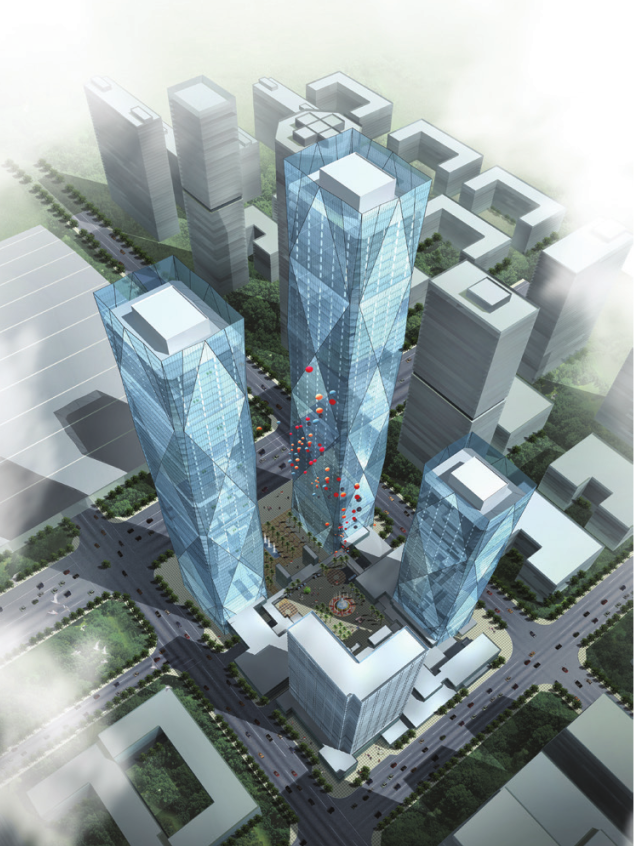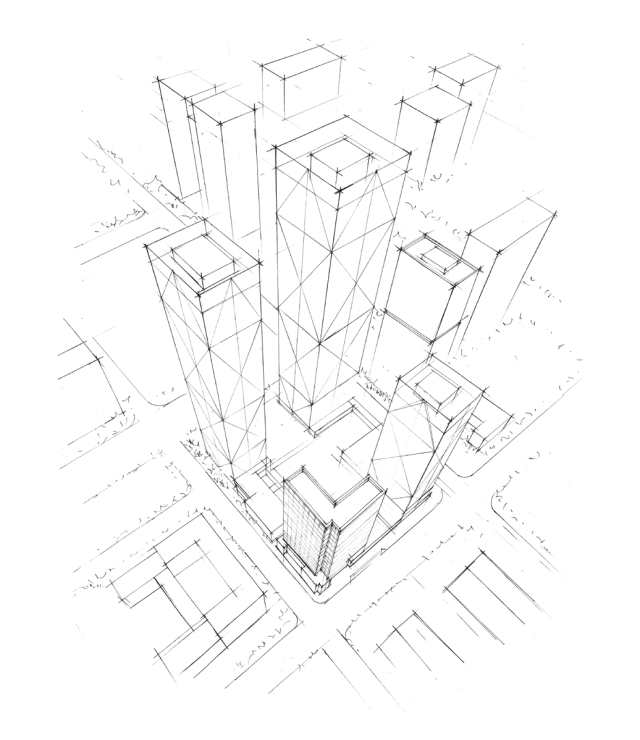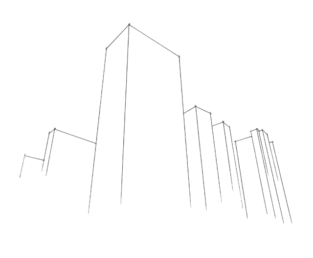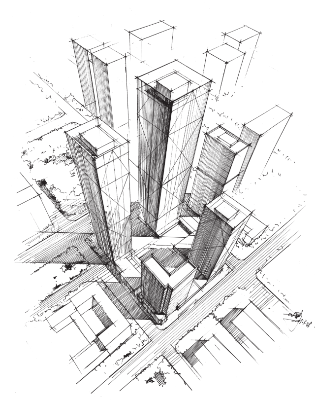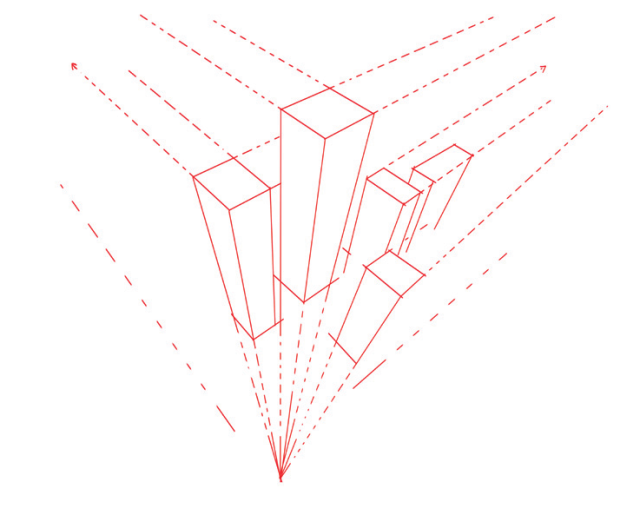 有些时候,一点透视和两点透视并不能表现出众多的建筑群,在表现大面积的建筑群时,我们会用到三点透视,用于超高层建筑的俯瞰图或仰视图。第三个消失点,必须和画面保持垂直的主视线,必须使其和视角的二等分线保持一致;三点透实际上就是在两点透视的基础上多加了一个天点或者地点,即仰视或者俯视,这种透视原理也叫作广角透视。在建筑设计和城市规划设计中经常用到三点透视的俯视画法,即鸟瞰图。