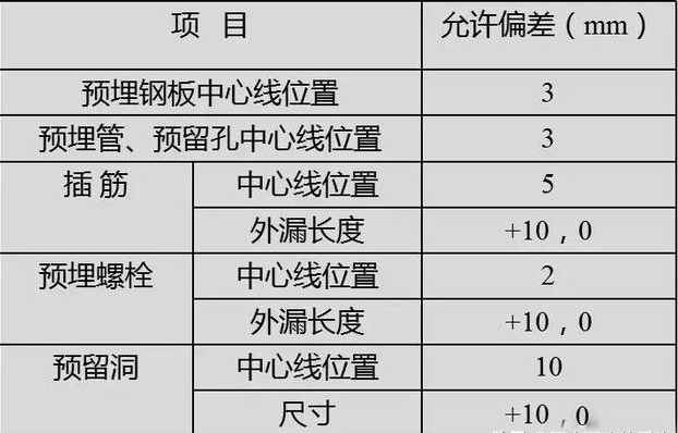 4、固定在模板上的预埋件、预留孔和预留洞均不得遗漏,且应安装牢固,其偏差应符合下表1规定。