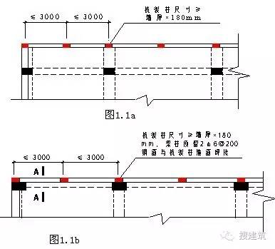 E.支承在悬臂梁和悬臂板上的墙体,应按图1.1a和图1.1b所示设置钢筋混凝土抗裂柱。尺寸及配筋同构造柱。