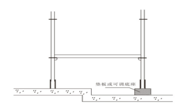 处理:可在降板位置立杆下设置较厚的垫板将立杆底部调至同一标高,或按《建筑施工承插型盘扣式钢管支架安全技术规程》要求使用可调底座。