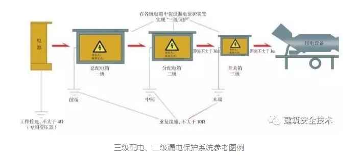 3、总配电箱中漏电保护器的额定漏电动作电流应大于30mA,额定漏电动作时间应大于0.1s,但其额定漏电动作电流与额定漏电动作时间的乘积不应大于30mAs。(JGJ46-20058.2.11)