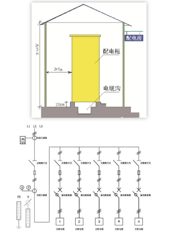 2. 配电柜侧面的维护通道宽度不小于1m;配电室顶棚与地面的距离不低于3m。