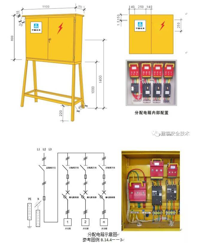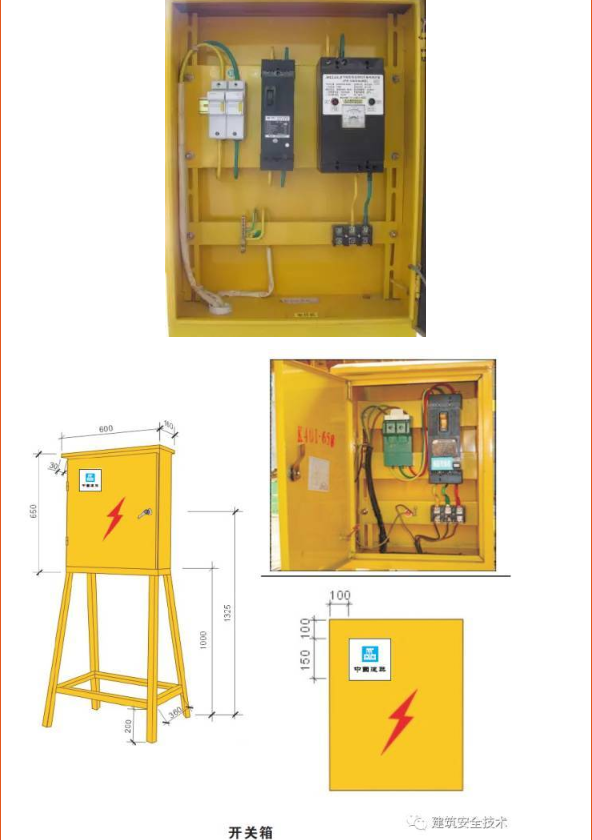 3. 开关箱漏电保护器的额定漏电动作电流不应大于30mA,额定漏电动作时间不应大于0.1S;使用于潮湿或有腐蚀介质场所的漏电保护器,其额定漏电动作电流不应大于15 mA, 额定漏电动作时间不应大于0.1S;配电箱支架应采用L40404角钢焊制,箱体颜色为中黄(做喷塑处理)、CI及闪电标示、尺寸规格如图所示。
