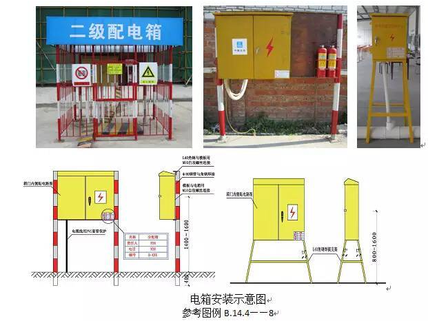 3、配电箱、开关箱应装设端正、牢固;固定式配电箱、开关箱的中心点与地面的垂直距离应为1.4~1.6m;移动式配电箱、开关箱应装设在坚固的支架上,其中心点与地面的垂直距离宜为0.8~1.6m。(JGJ46-2005第8.1.8条)