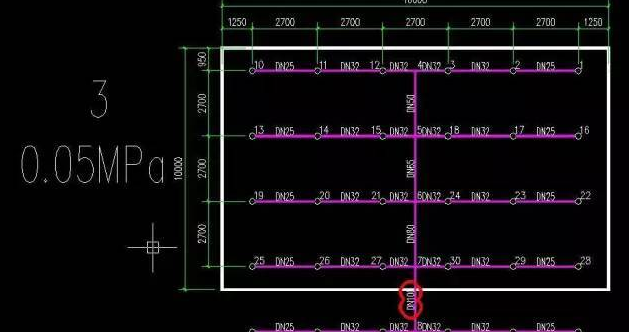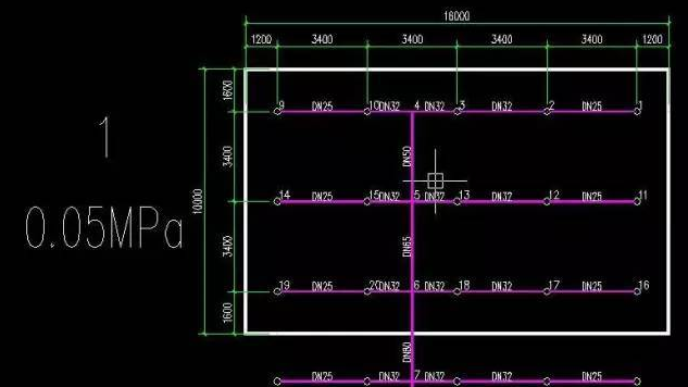 地下室喷头布置,正方形最大间距3.4m,上图就按最大间距布置,最不利点喷头压力取0.05,用天正软件算的,具体计算估计多数朋友会,不会的自己摸索一下,不难