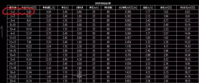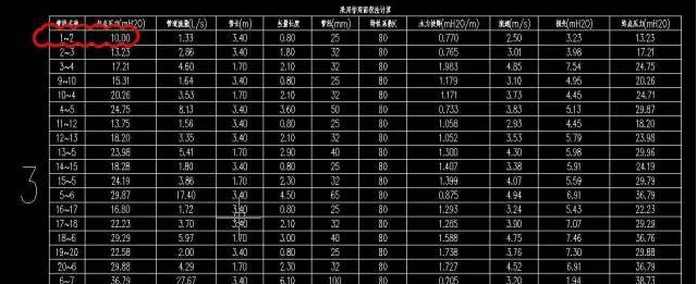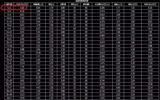 结果就是图中圈出的这几段管道按原管径,会超过5的流速限制需要加大管径各位注意对比图1和图2,有兴趣的朋友也可以自己去算算,而按0.1最不利点计算的结果就是表3: