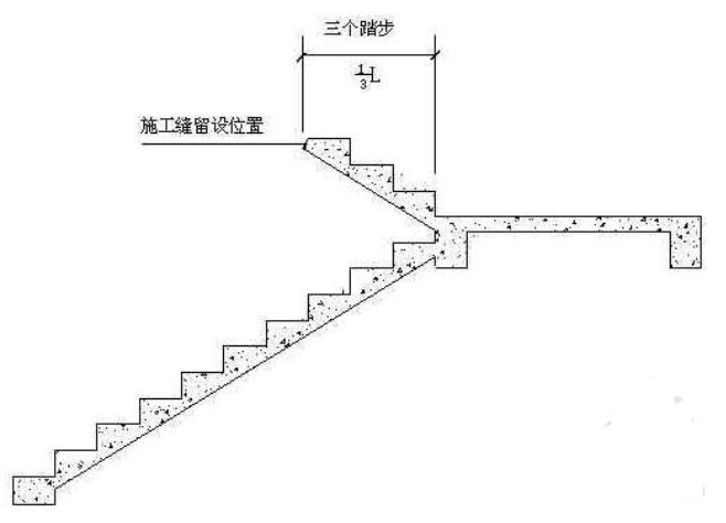 理论上,楼梯的施工缝应留在1/3净跨处,但实际操作留在梯梁根部的不是没有,主要是因为梯板斜向施工缝不易处理好。有人专门进行过比较,发现留在1/3处大部分梯板都出现裂缝,而留在根部的反而没有,这和施工单位水平、施工操作工艺有很大关系。