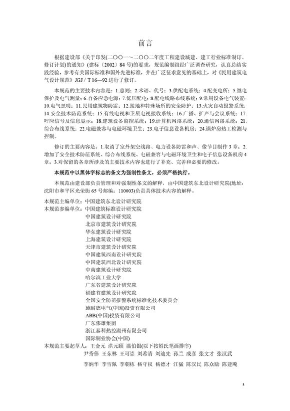 本规范内容包括:供配电系统、配变电所、继电保护、低压配电、电气照明、民用建筑防雷、计算机网络系统等相关民用建筑电气的设计规范。