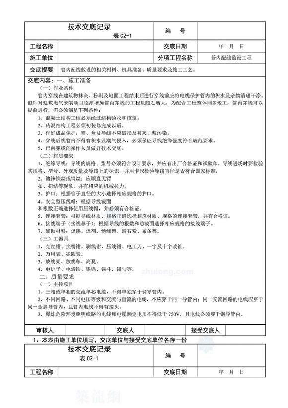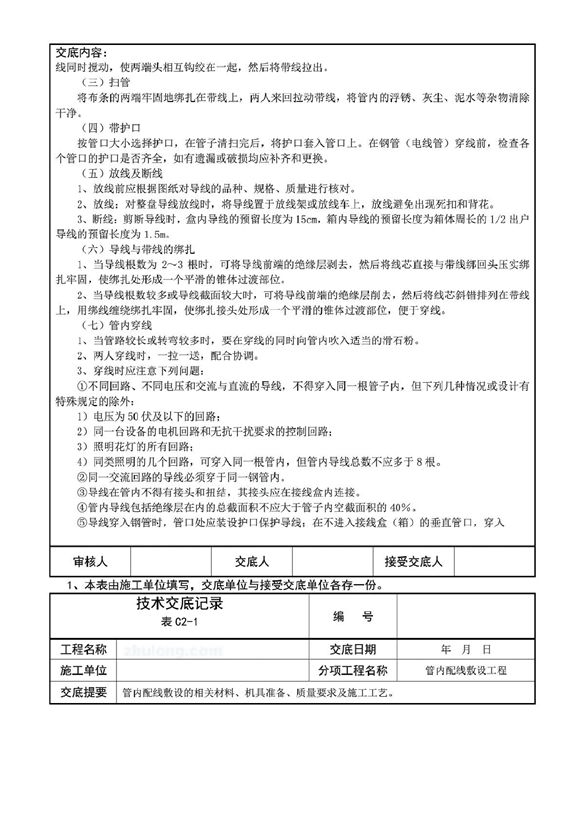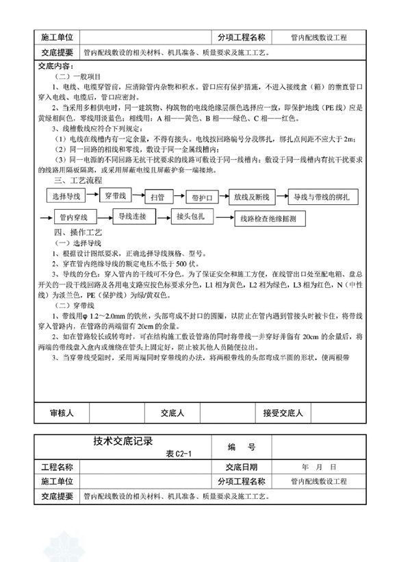 水电安装全套技术交底,管内穿线在建筑物抹灰、粉刷及地面工程结束后进行穿线前应将电线保护管内的积水及杂物清理干净。但针对建筑电气安装项目逐渐增加管内穿线的工程量随之增大,为配合工程整体同步竣工,管内穿线