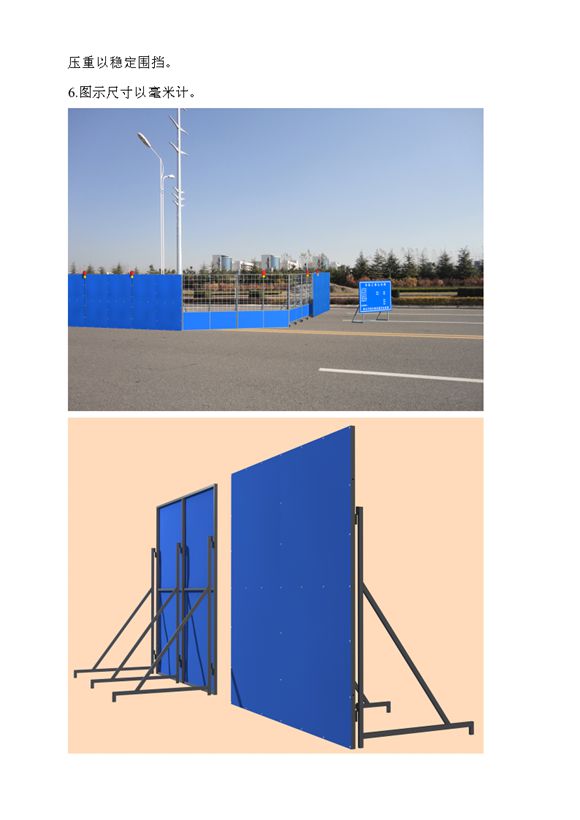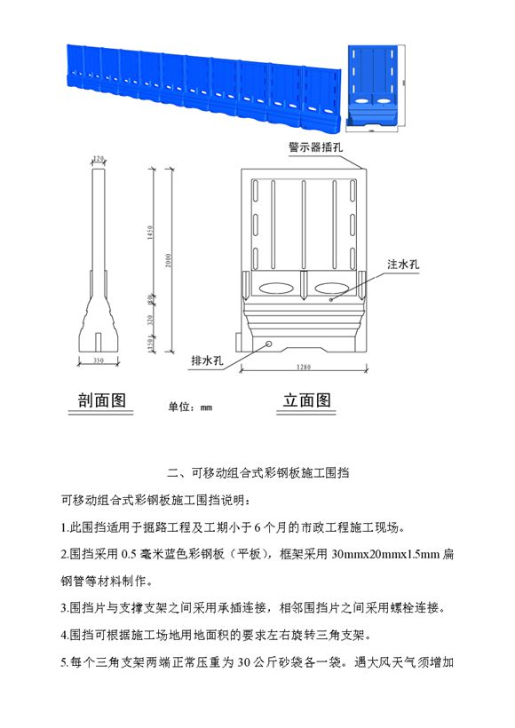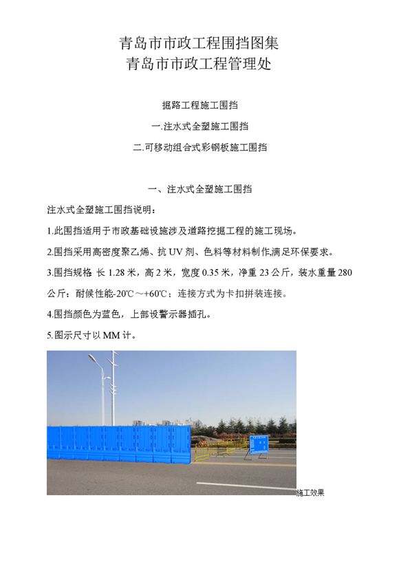 1.此围挡适用于市政基础设施涉及道路挖掘工程的施工现场。2.围挡采用高密度聚乙烯、抗UV剂、色料等材料制作,满足环保要求。3.围挡规格:长1.28米,高2米,宽度0.35米,净重23公斤,装水重量