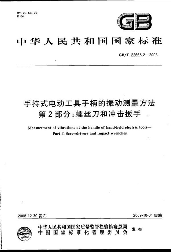 国家标准《手持式电动工具手柄的振动测量方法 第2部分:螺丝刀和冲击扳手》由TC68(全国电动工具标准化技术委员会)归口上报及执行,主管部门为中国电器工业协会。