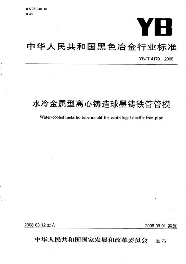 本标准规定了水冷金属型离心铸造球墨铸铁管管模(以下简称管模)公称口径、结构型式与尺寸、技术要求、试验方法、检验规则及标志、包装、运输、贮存。 本标准适用于锻造和挤压成型的管模。