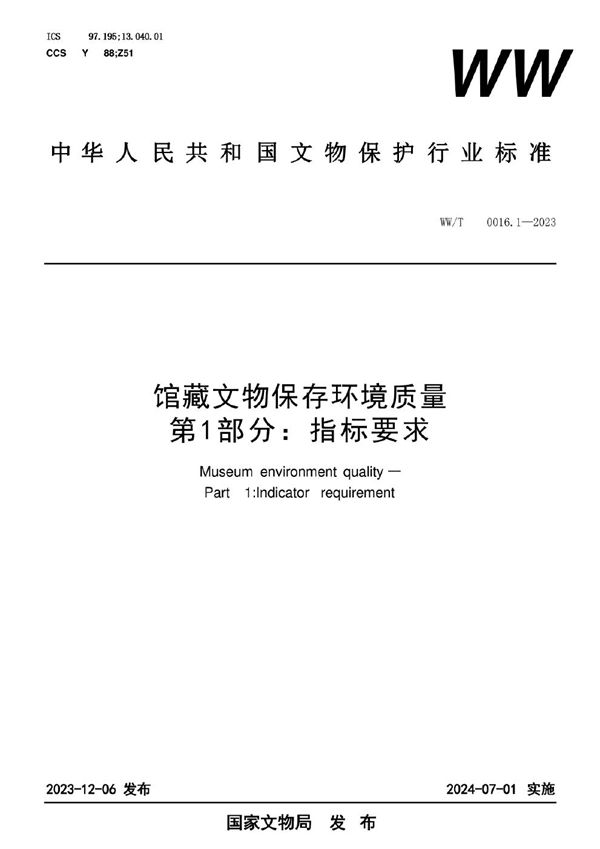 馆藏文物保存环境质量 第1部分:指标要求 (WW/T 0016.1-2023)